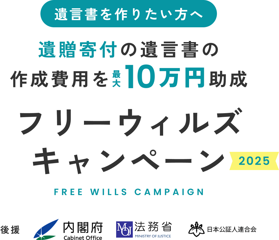 「フリーウィルズキャンペーン」は、遺贈寄付を含む遺言書作成にかかる、弁護士等の専門家報酬の一部(最大10万円)を助成する取り組みです。